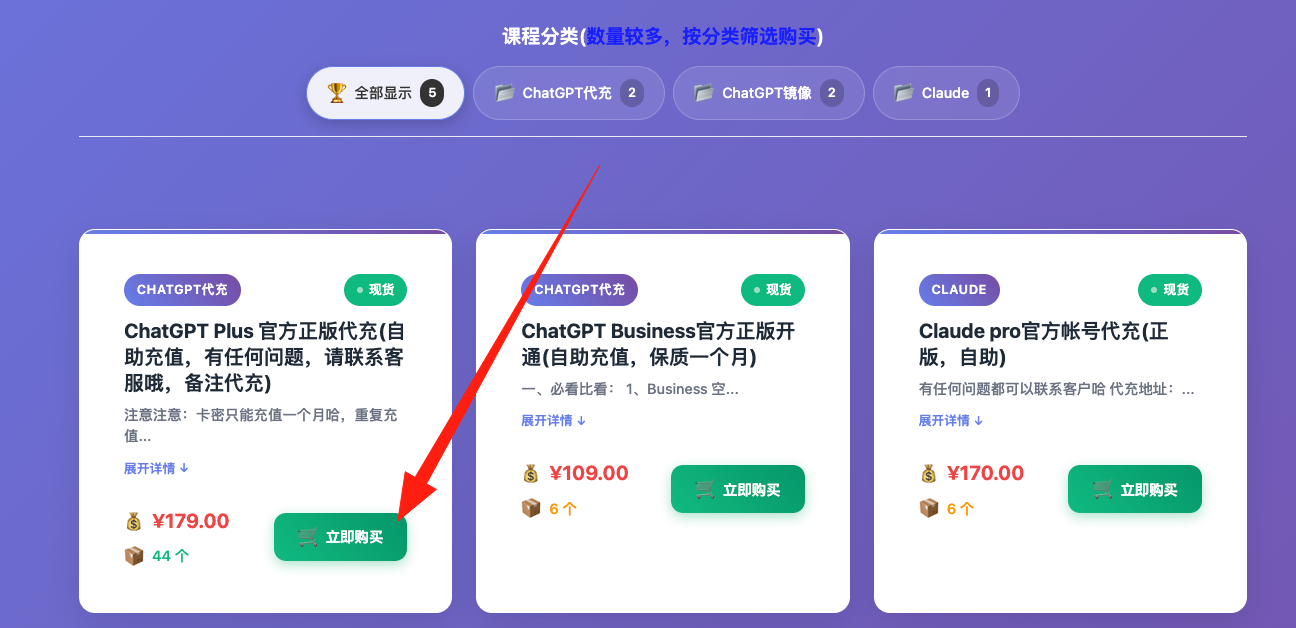 2、然后选择对应的充值套餐,这里选择 ChatGPT Plus,点击 立即购买,会跳转到卡密购买页面