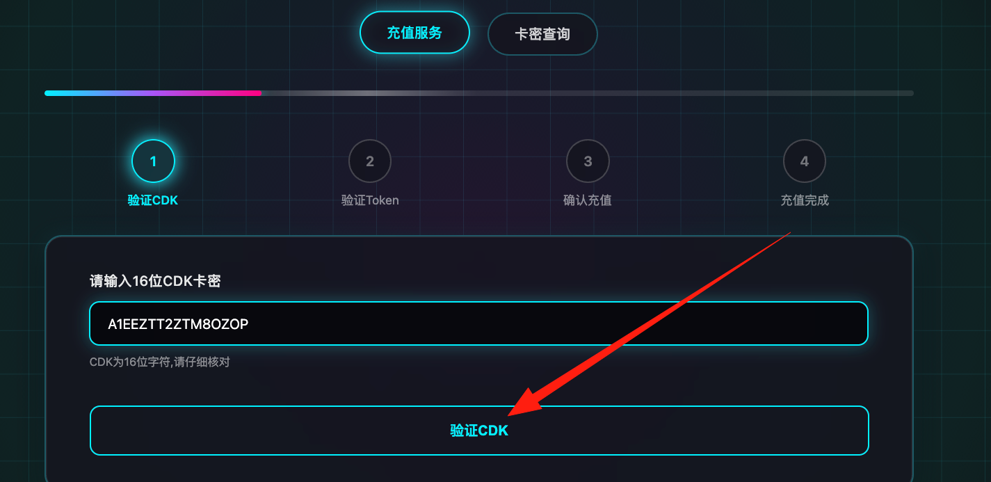 1、进入充值系统:https://ai.iamshuaidi.com/daichong,然后输入刚才购买的卡密验证