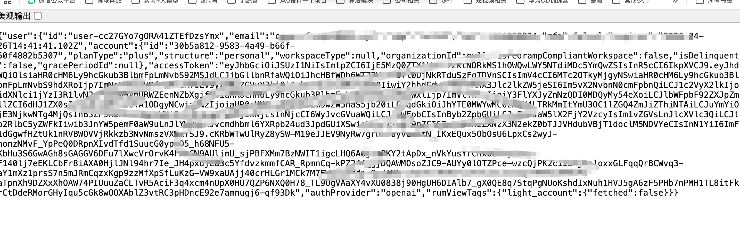 登陆成功后,点击 https://chatgpt.com/api/auth/session 可以获取到 token,把下面那一大串复制